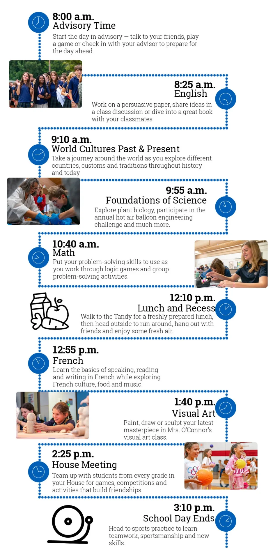 The Middle School day begins with Advisory, a time to check in with a faculty member and a small cohort of students. Academic blocks are broken up with recess, lunch, and arts and athletic classes. Beginning in 7th Grade, students may join a competitive athletic team or continue with PE. Both options occur at the end of the academic day.