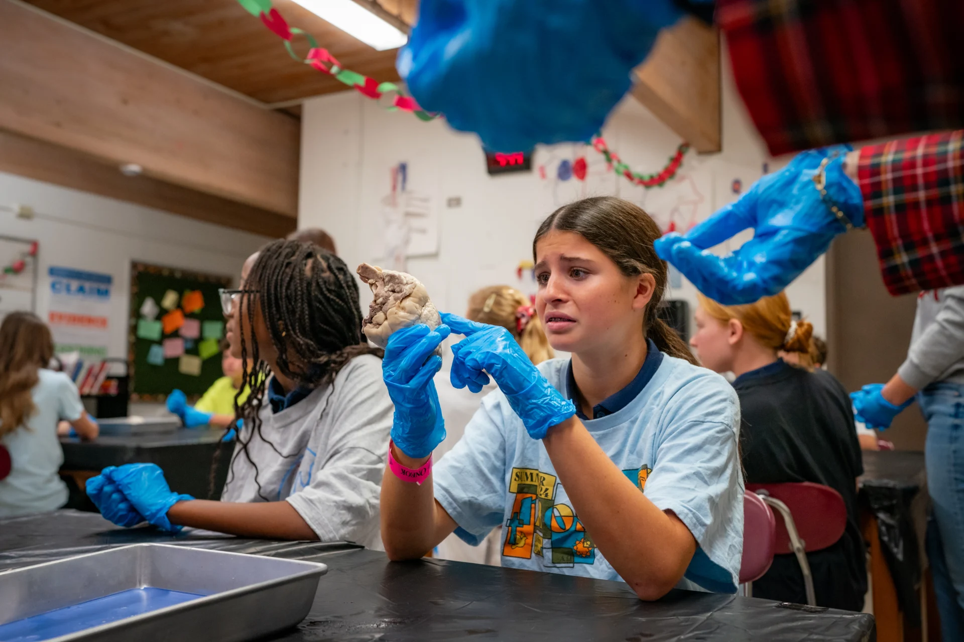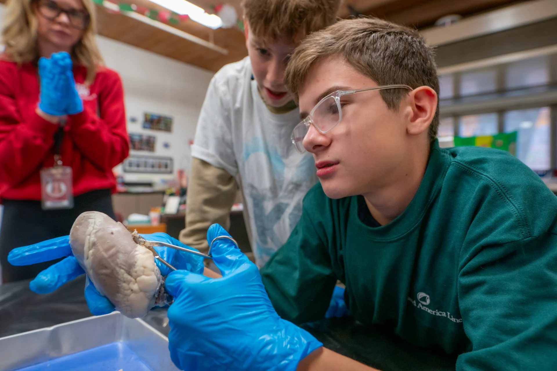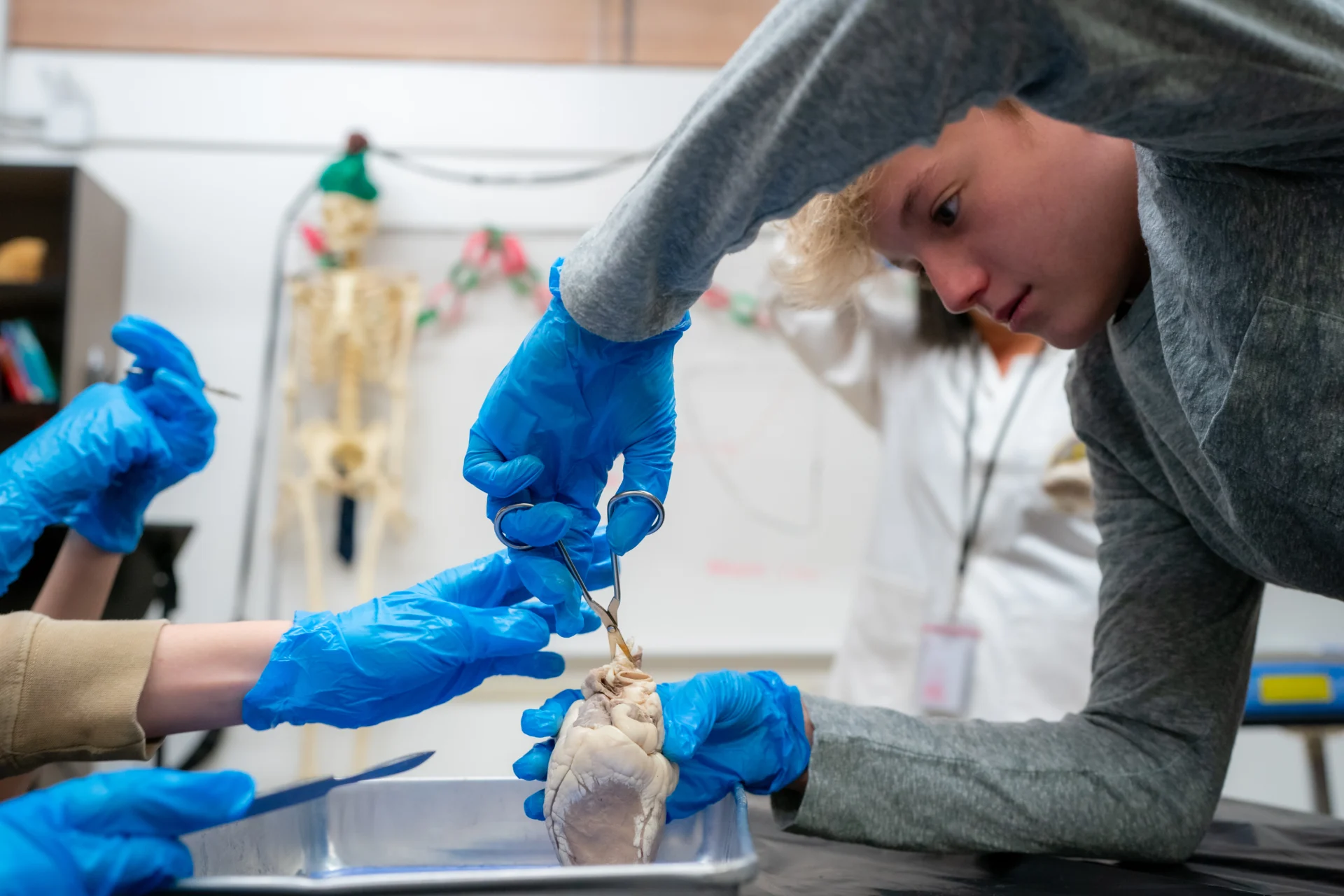 Students paired up at their desks and got to work on the hearts. There are no lab stations, just pans and scalpels on desks, with parent volunteers close by to help supervise.